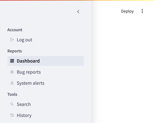 The following example creates two menu states. When a user starts a new session, they are not logged in. In this case, the only available page is the login page. If a user tries to access another page by URL, it will create a new session and Streamlit will not recognize the page. The user will be diverted to the login page. However, after a user logs in, they will see a navigation menu with three sections and be directed to the dashboard as the app's default page (i.e. homepage).